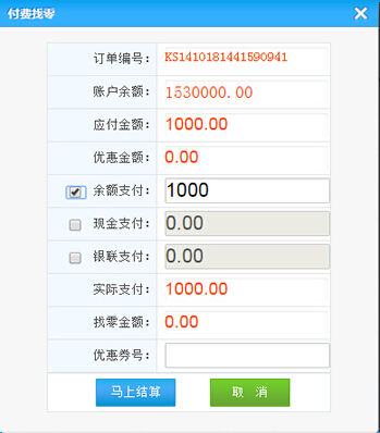 點(diǎn)擊結(jié)算按鈕將彈出付費(fèi)找零界面,點(diǎn)擊馬上結(jié)算可完成消費(fèi):